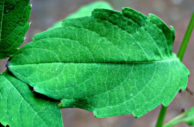 Blätter unten gegen-, oben wechselständig, länglich bis eiförmig, dünn, moderat gesägt oder gekerbt, gestielt, die oberen fast sitzend. Blattbasis gerundet oder keilförmig, Spitze stumpf. Blätter auf der Oberseite dunkler als auf der Unterseite.
