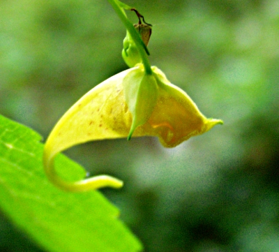 Blüten zu 2–6 in hängenden Trauben in den Achseln der Tragblätter, 3–4 cm lang, mit einem bis zu 90° nach unten und vorne gebogenem Sporn. Gelb mit roten Punkten im Innern der Blüte.