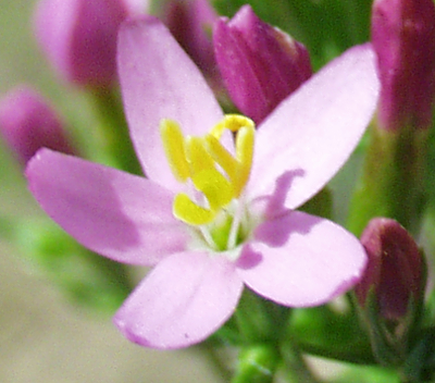 Blütenstand, Blüte und Stängelblätter des Echten Tausendgüldenkrauts
