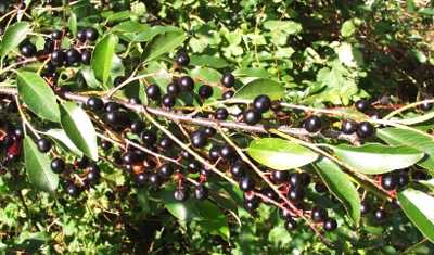 Die Späte Traubenkirsche (Prunus serotina) stammt ebenfalls aus Nordamerika. Sie säumt zahlreiche Fuß- und Radwege entlang der Ems und wird von dort auch wohl nie wieder verschwinden. Man kann ihr allerdings etwas Positives abge­winnen: Die Unfrüchte dieses Unbaums sind essbar und wie ich finde ungemein lecker, besonders wenn die Sonne knallt, man irgendwo zwischen Meppen und Bokeloh umherirrt, und die Wasserflasche vergessen hat.