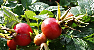 Zum Schluss möchte ich noch einen Unstrauch präsentieren: Rosa rugosa, die Kartoffelrose. Die Wildrose mit dem melodischen wissenschaftlichen Namen wächst so ziemlich überall am Straßenrand und bildet undurch­dringliche Dornrös­chen-Hecken. Die äußere Schale der Früchte allerdings ist essbar und sehr Vitamin-C-reich, außerdem liefern die Nüsschen im Inneren ein leistungsstarkes Juckpulver.